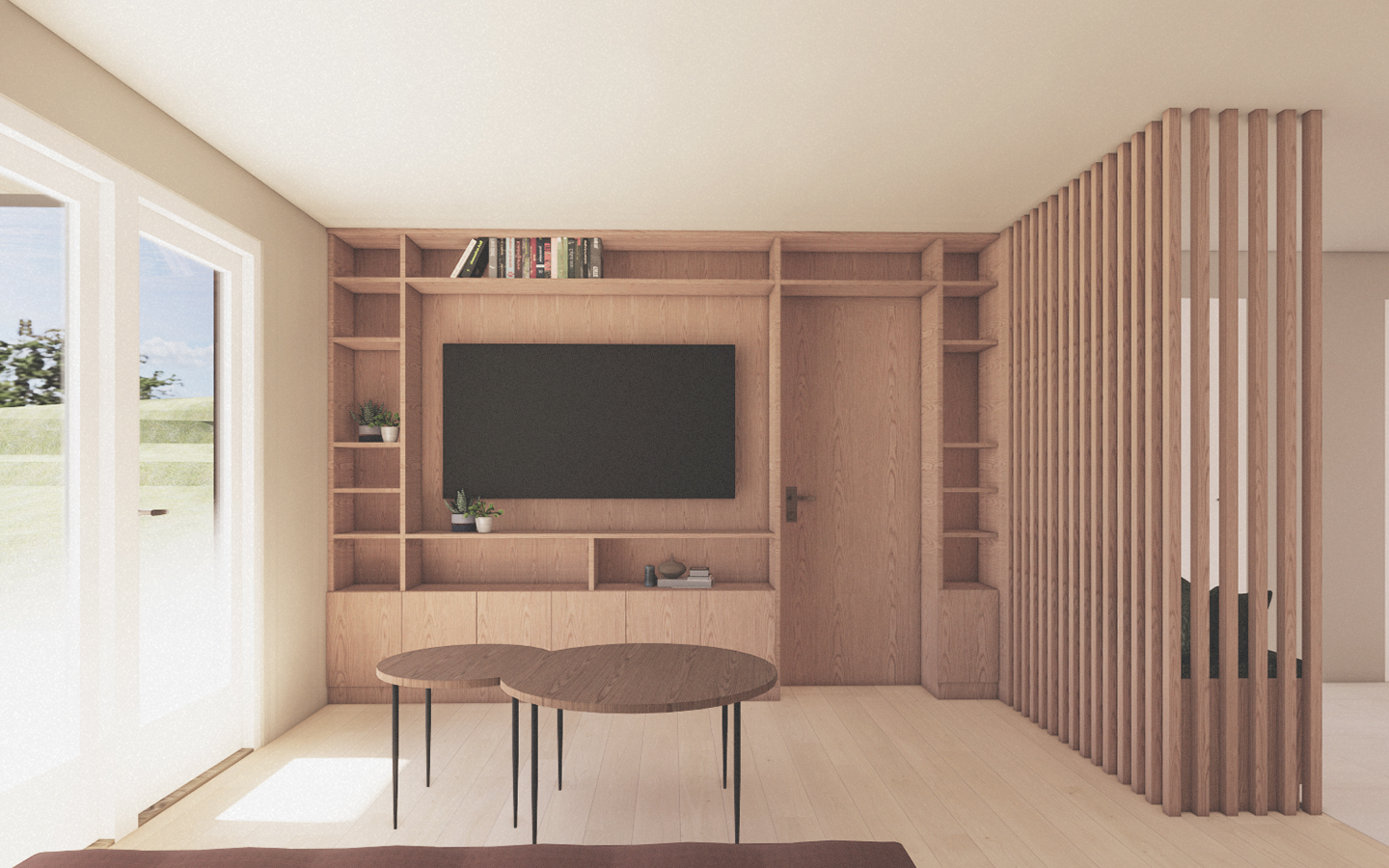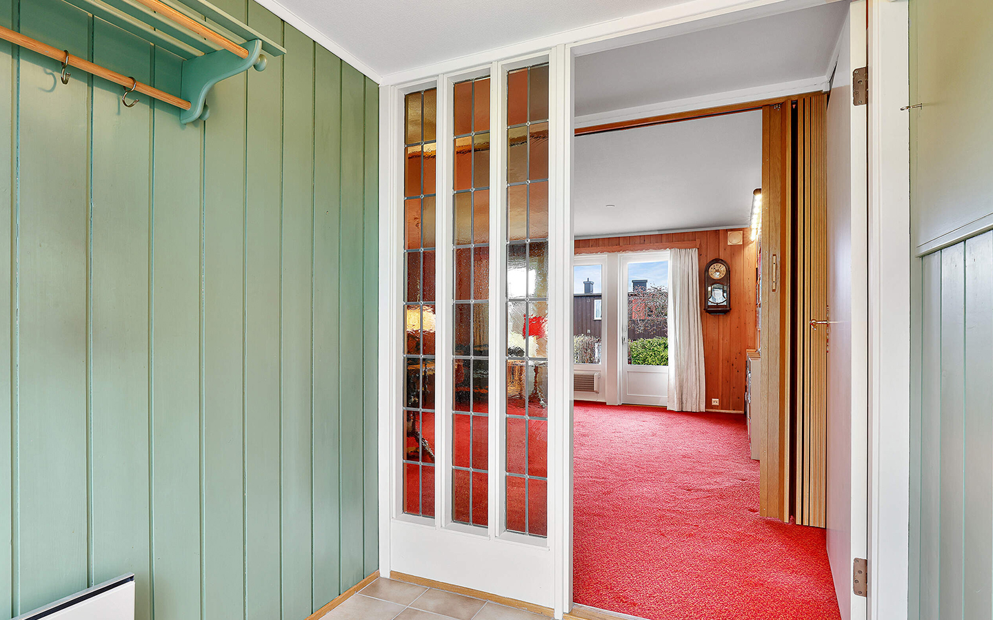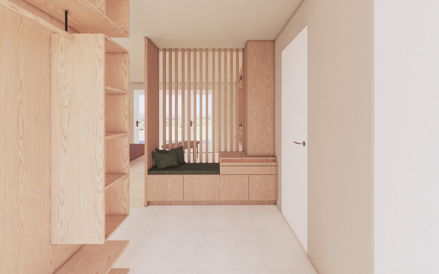 For å få mer luft og plass ble eksisterende vegg i gang revet, og erstattet med et sittemøbel. Dette møbelet fungerer som oppbevaring men også som en soneinndeler, med spiler bak som deler tv stua fra gangen samtidig som den slipper inn lys.