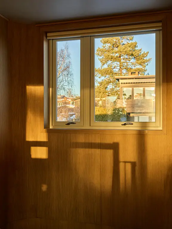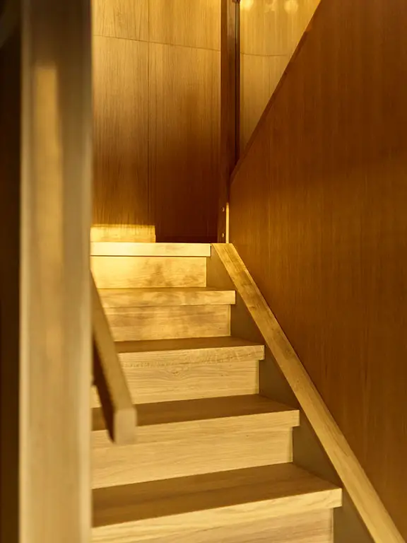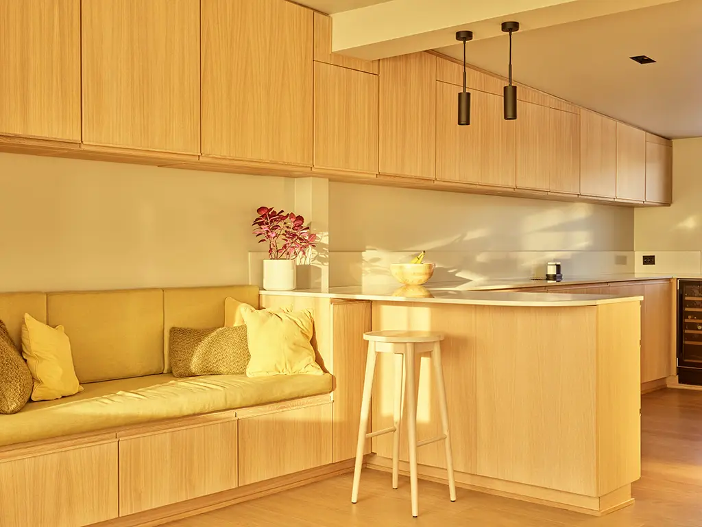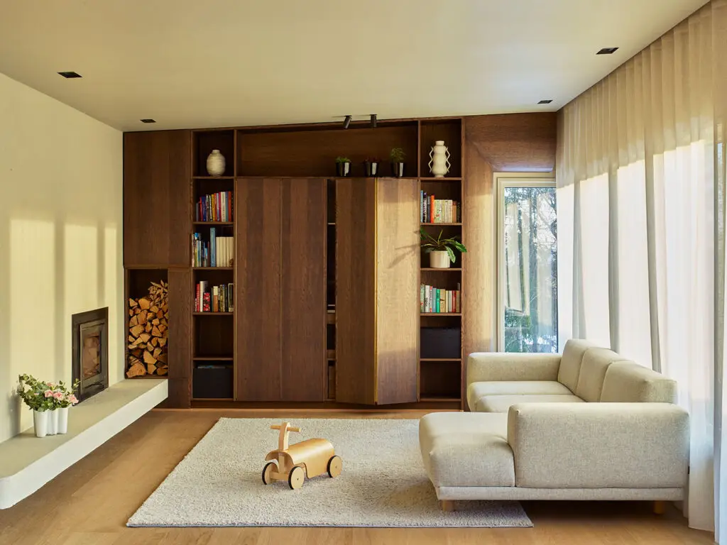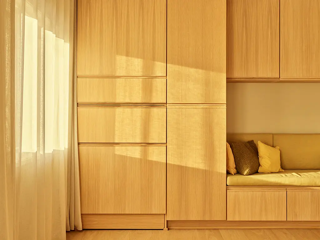 For å få mer luft og plass ble eksisterende vegg i gang revet, og erstattet med et sittemøbel. Dette møbelet fungerer som oppbevaring men også som en soneinndeler, med spiler bak som deler tv stua fra gangen samtidig som den slipper inn lys.