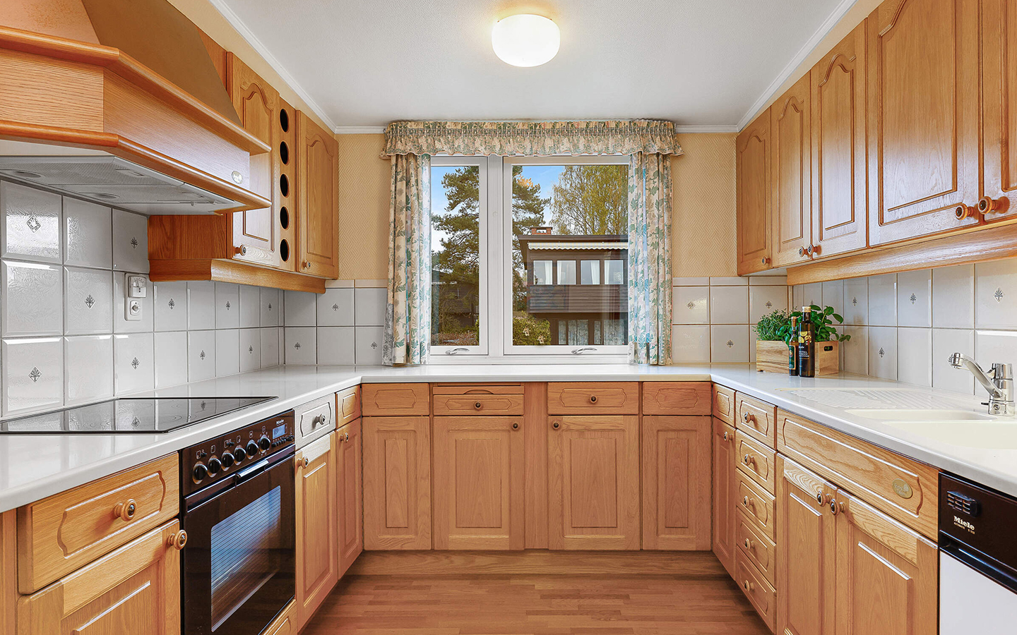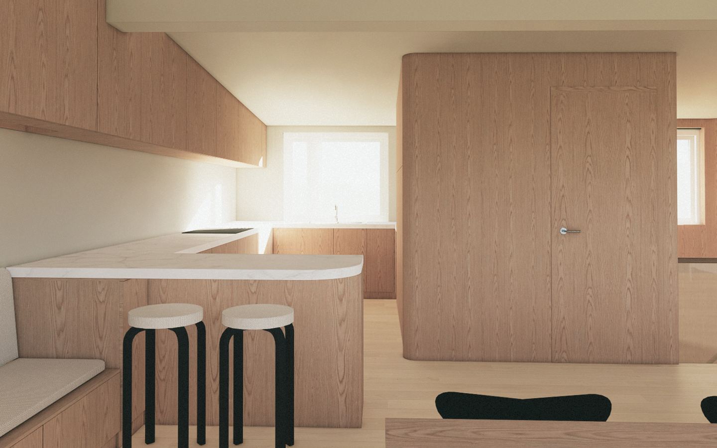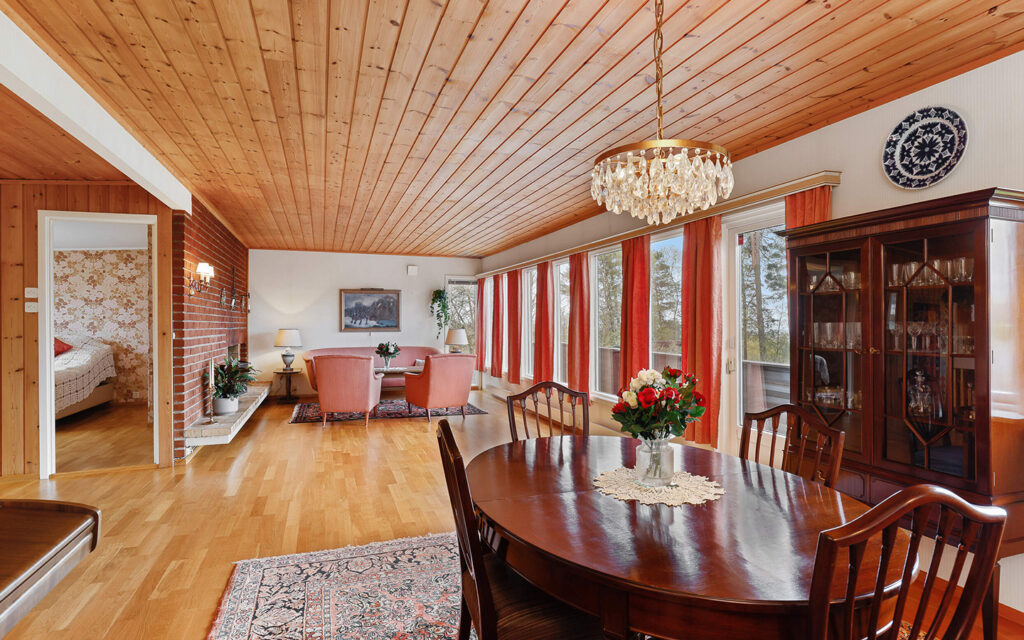 For å få en luftigere planløsning i 2 etg, ble bærende vegg erstattet med en bjelke og søyle, og veggen til kjøkkenet ble fjernet. Det nedlektede undertaket ble revet slik at maksimal takhøyde ble oppnådd. Bilder viser før / etter.